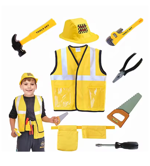 زي سترة عامل البناء للأطفال الصغار، مجموعة لعب مكونة من 5 قطع، سترة عاكسة صفراء مع أدوات، فستان الحفلات