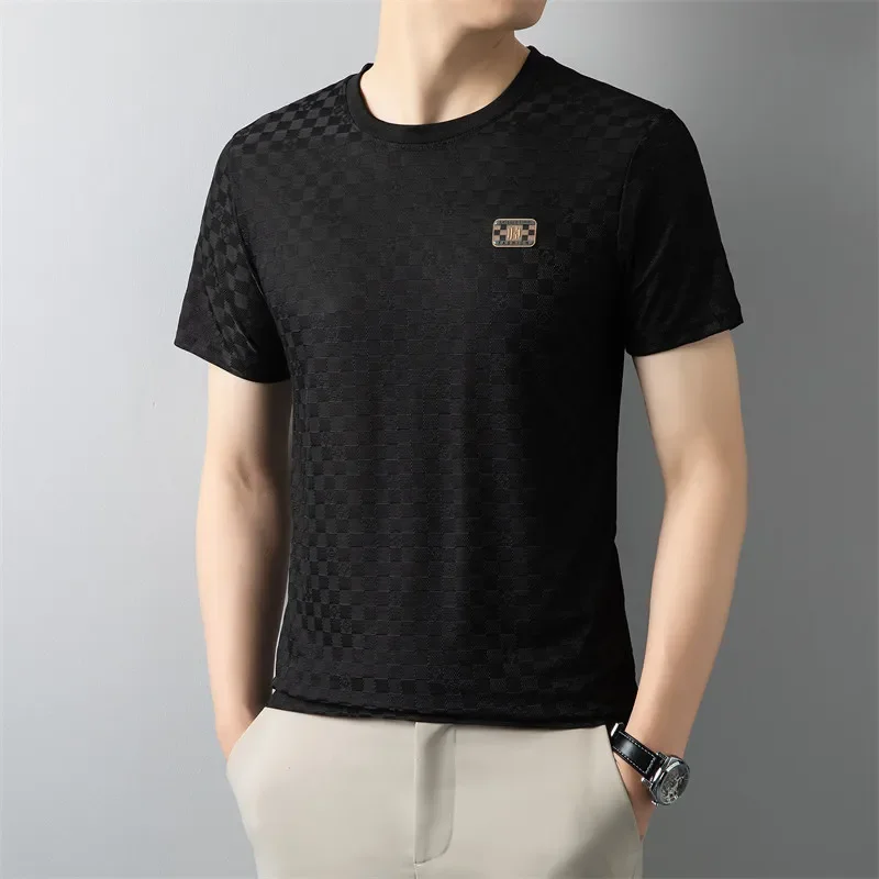تي شيرت رجالي جديد كاجوال وعصري بأكمام قصيرة ورقبة دائرية مع نمط شارة، قميص صيفي مريح ومتعدد الاستخدامات